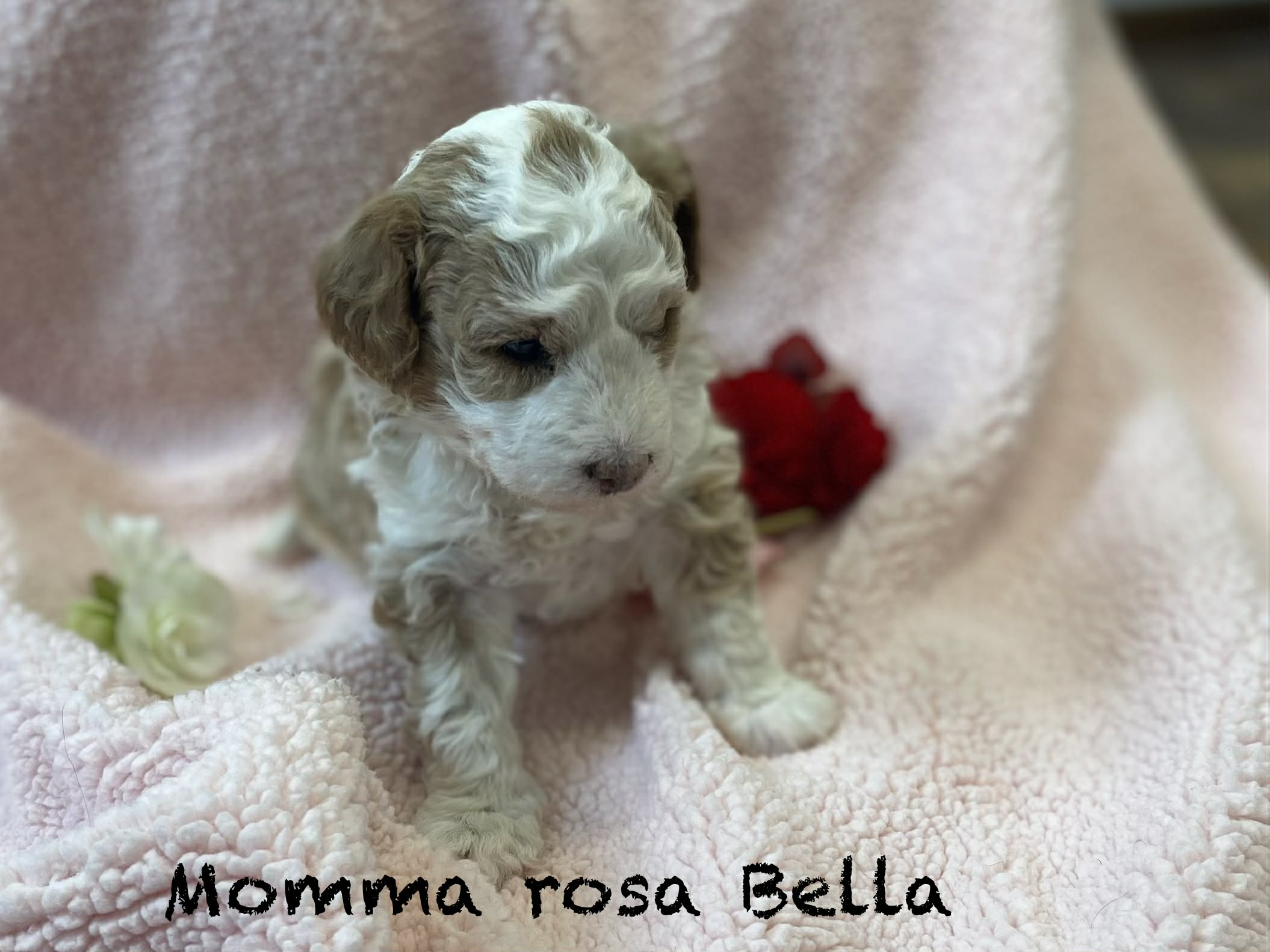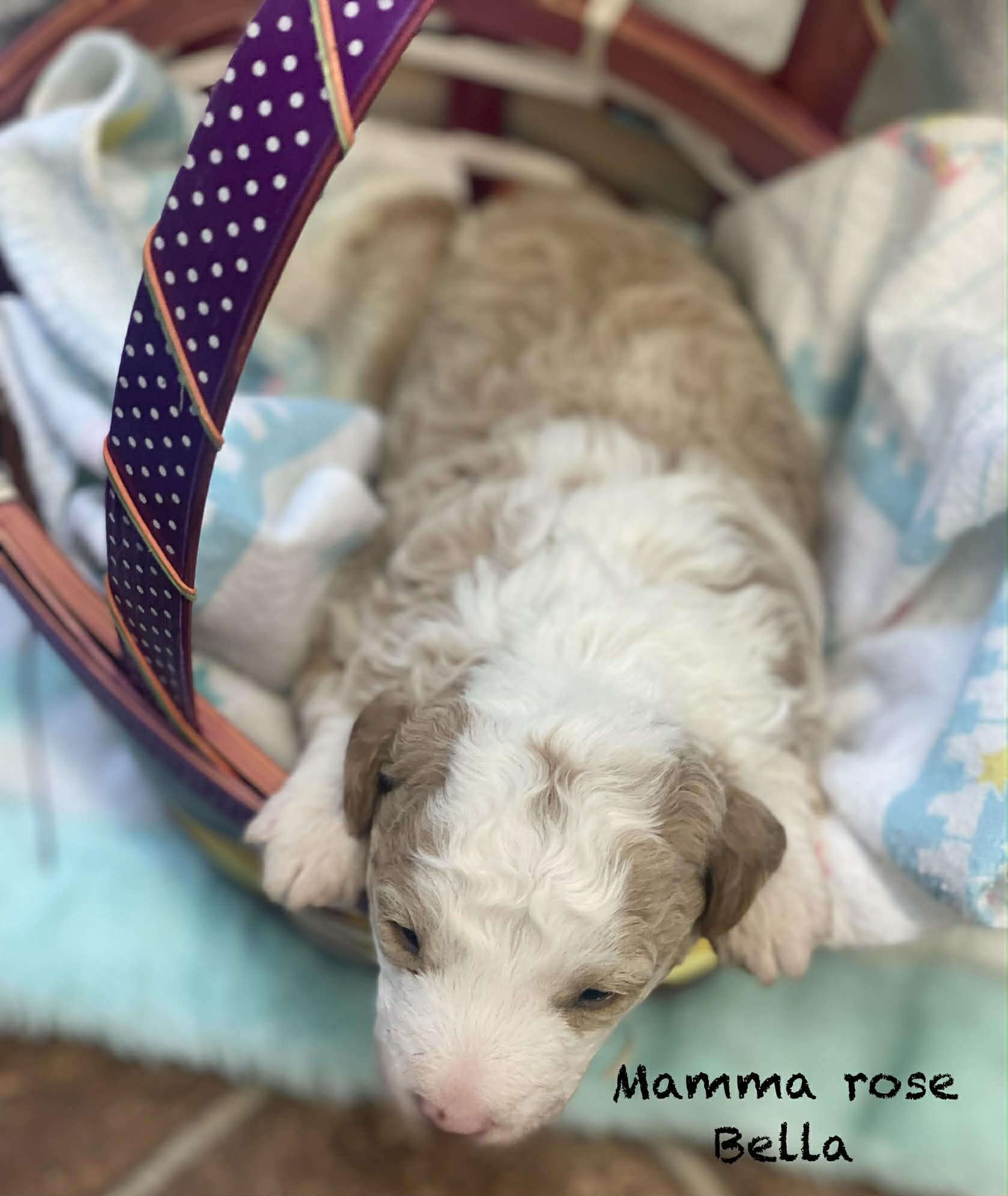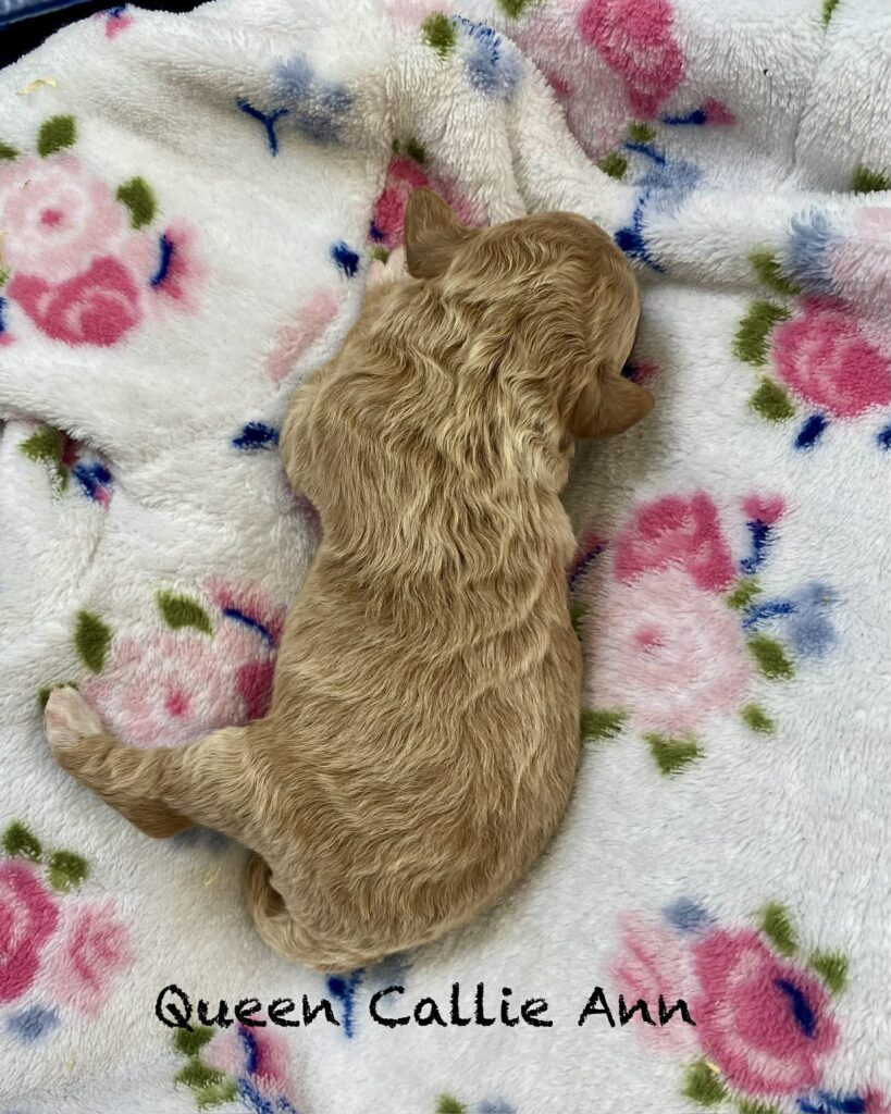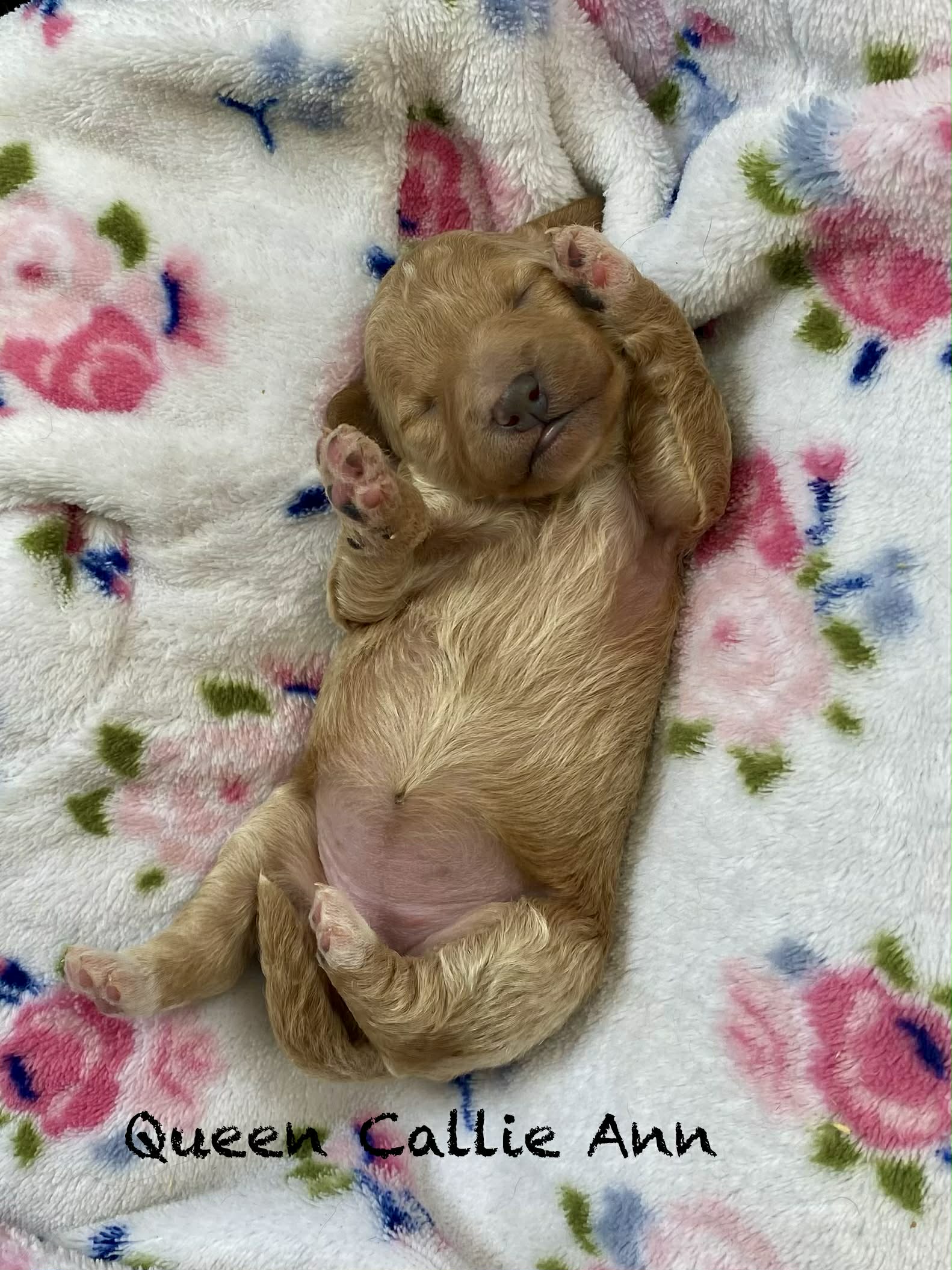 • Dam: Jingles, an F1B Mini Goldendoodle (15 lbs).